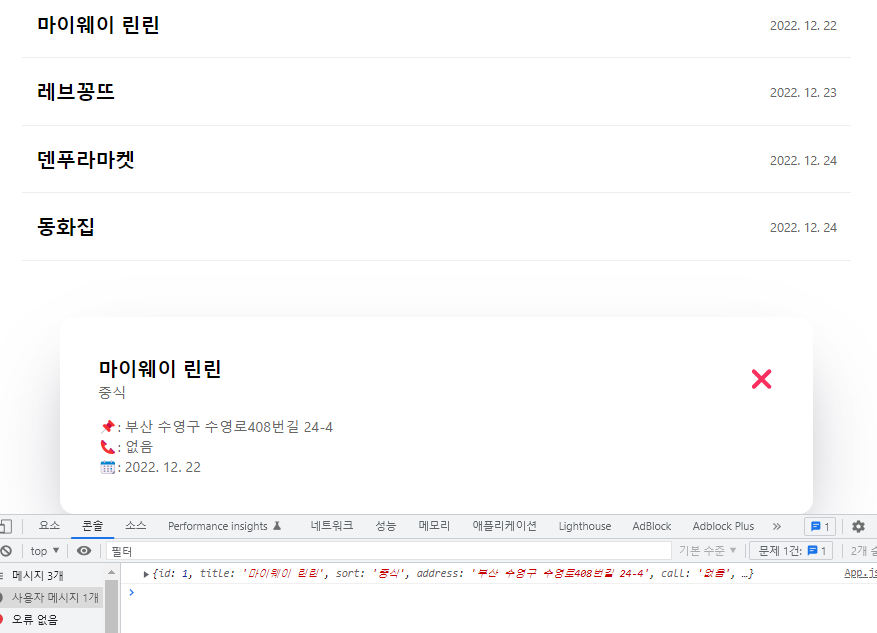 다른 list item을 클릭해도 잘 뜨고, 닫기 버튼도 잘 작동합니다.