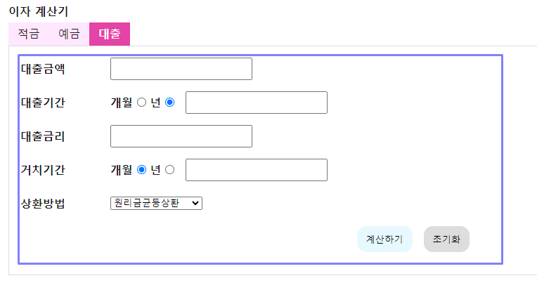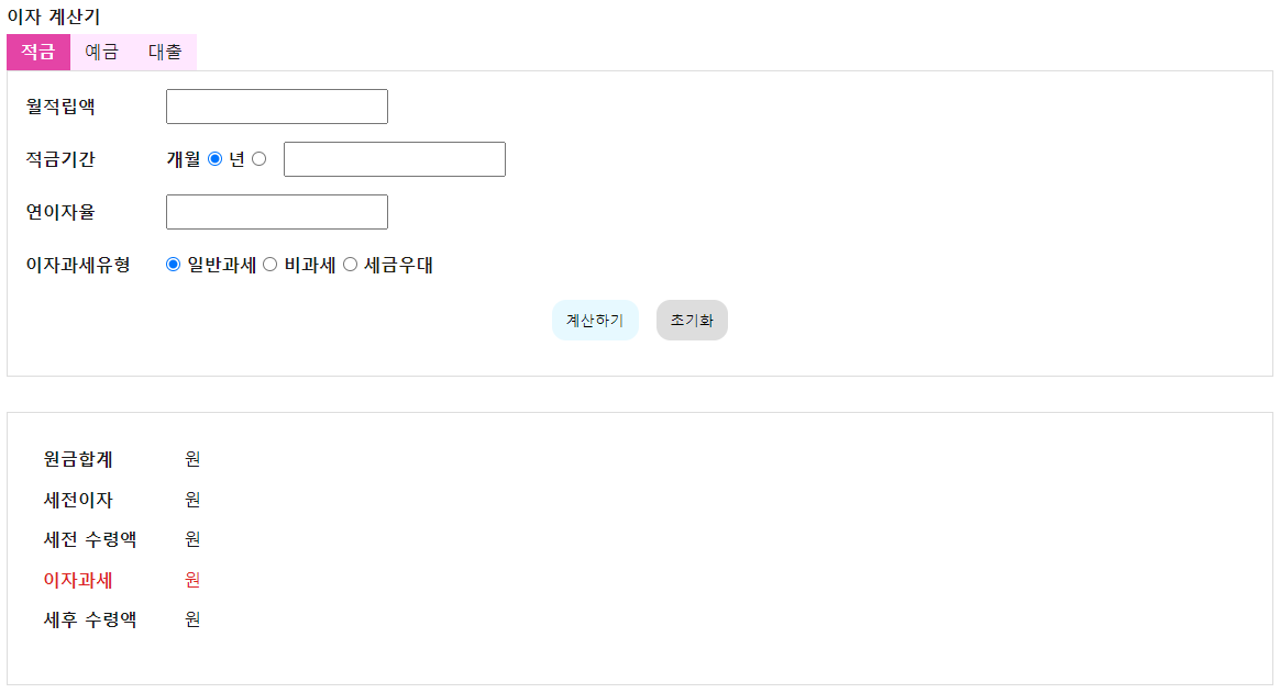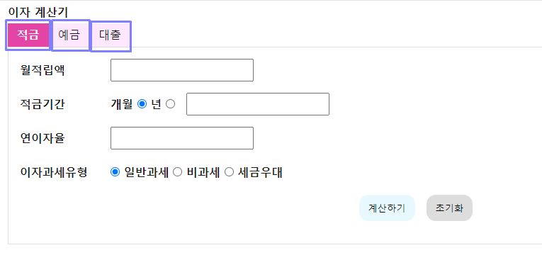 적금, 예금, 대출 탭과 각각의 숫자를 적을 수 있는 form을 만들고,
